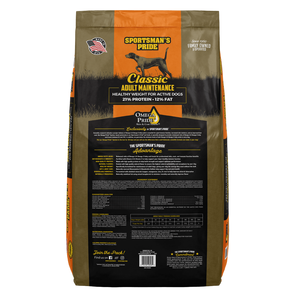 Sportsman's Pride Maintenance Adult Formula is a complete and balanced diet that promotes good health and a long life. It is ideal for the family dog with light to moderate activity levels for working dogs in the off season. Made with our exclusive Omega Pride Skin & Coat System.