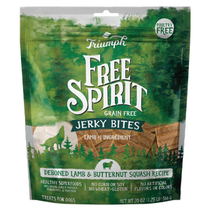 Feed your dog's wild side with the Triumph Free Spirit Grain Free Lamb & Butternut Squash Recipe Jerky Bites Dog Treats. Made with real Deboned Lamb with no corn, wheat, gluten, soy or any artificial colors, flavors, or preservatives. Your dog will love the flavor and soft and chewy texture. They're made with wholesome ingredients and superfoods like butternut squash for a natural boost. And they're perfect for training or anytime your dog deserves a wholesome, grain-free reward.
