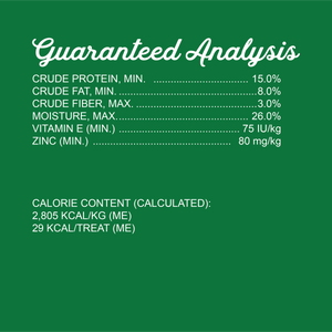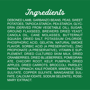 DEBONED LAMB, GARBANZO BEANS, PEAS, SWEET POTATOES, TAPIOCA STARCH, PEA STARCH, GLYCERIN (DERIVED FROM VEGETABLE OIL), SUGAR, GROUND FLAXSEED, BREWERS DRIED YEAST, CANOLA OIL, CANE MOLASSES, BUTTERNUT SQUASH, DRIED SALT, POTASSIUM CHLORIDE, PHOSPHORIC ACID, GELATIN, NATURAL SMOKE FLAVOR, SORBIC ACID (A PRESERVATIVE), ZINC PROPIONATE (A PRESERVATIVE), VITAMIN E SUPPLEMENT, DRIED CULTURED SKIM MILK, DRIED CRANBERRIES, DRIED BLUEBERRIES, POMEGRANATE, CHICORY ROOT, KELP, PUMPKIN, DRIED APPLES, DRIED CARROTS, BROCCOLI, PARSLEY, PAPAYA, SPINACH, KALE POWDER, MINERALS (ZINC SULFATE, COPPER SULFATE, MANGANESE SULFATE, CALCIUM IODATE, SODIUM SELENITE), ROSEMARY EXTRACT.Guaranteed Analysis