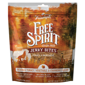 Feed your dog's natural Free Spirit with Triumph Free Spirit Jerky Bites Dog Treats. These treats are made with some of nature's best ingredients without any artificial colors or flavors. Each and every soft and chewy bite of our delicious, savory jerky bites are made with the highest quality, wholesome ingredients we know your dog will love. Made in the USA, we use real Turkey in our recipe, which your dog will love. When combined with select vegetables these Free Spirit jerky bites are the ideal treat for any lucky pup. Don't forget to check out our line of Triumph Free Spirit and Wild Spirit Pet Foods!