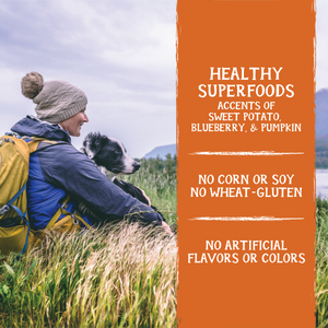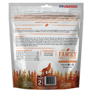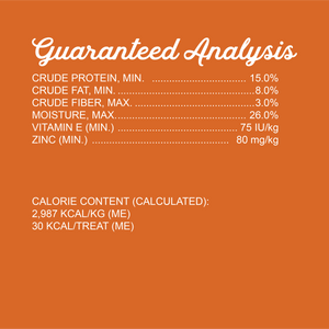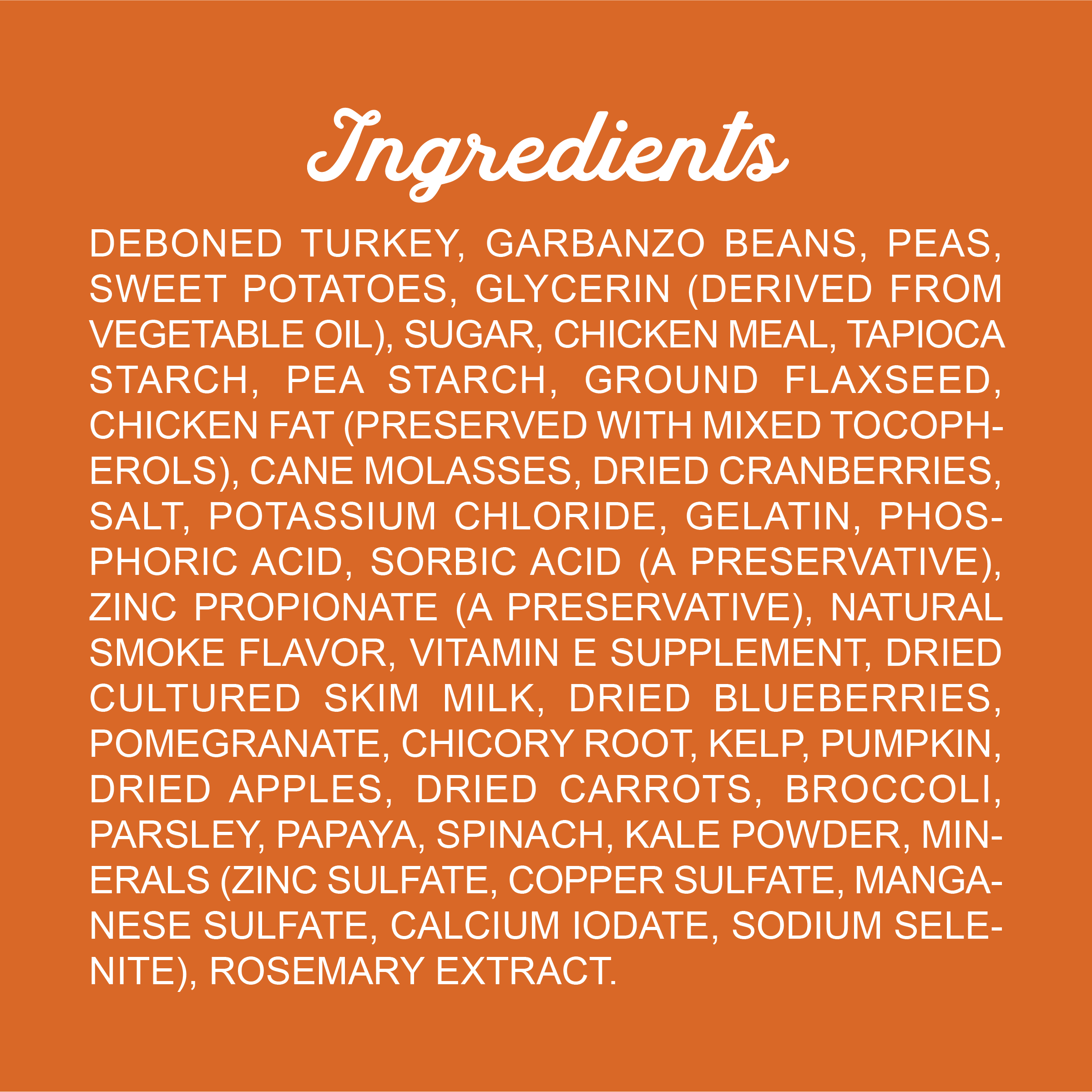DEBONED TURKEY, GARBANZO BEANS, PEAS, SWEET POTATOES, GLYCERIN (DERIVED FROM VEGETABLE OIL), SUGAR, CHICKEN MEAL, TAPIOCA STARCH, PEA STARCH, GROUND FLAXSEED, CHICKEN FAT (PRESERVED WITH MIXED TOCOPHEROLS), CANE MOLASSES, DRIED CRANBERRIES, SALT, POTASSIUM CHLORIDE, GELATIN, PHOSPHORIC ACID, SORBIC ACID (A PRESERVATIVE), ZINC PROPIONATE (A PRESERVATIVE), NATURAL SMOKE FLAVOR, VITAMIN E SUPPLEMENT, DRIED CULTURED SKIM MILK, DRIED BLUEBERRIES, POMEGRANATE, CHICORY ROOT, KELP, PUMPKIN, DRIED APPLES, DRIED CARROTS, BROCCOLI, PARSLEY, PAPAYA, SPINACH, KALE POWDER, MINERALS (ZINC SULFATE, COPPER SULFATE, MANGANESE SULFATE, CALCIUM IODATE, SODIUM SELENITE), ROSEMARY EXTRACT.Guaranteed Analysis