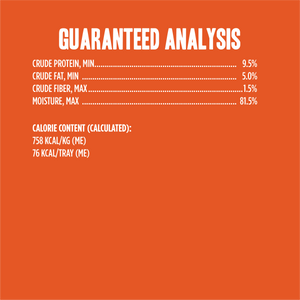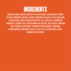 Deboned Turkey, Water Sufficient For Processing, Chicken Liver, Turkey, Calcium Carbonate, Powdered Cellulose, Locust Bean Gum, Carrageenan, Sodium Tripolyphosphate, Salt, Canola Oil, Magnesium Carbonate, Ascorbic Acid, Copper Amino Acid Chelate, Zinc Sulfate, Xantham Gum, Vitamin E Supplement, Thiamine Hydrochloride, Pyridoxine Hydrochloride, Manganese Sulfate, Folic Acid, Calcium Iodate, Biotin, Vitamin D3 Supplement.Guaranteed Analysis