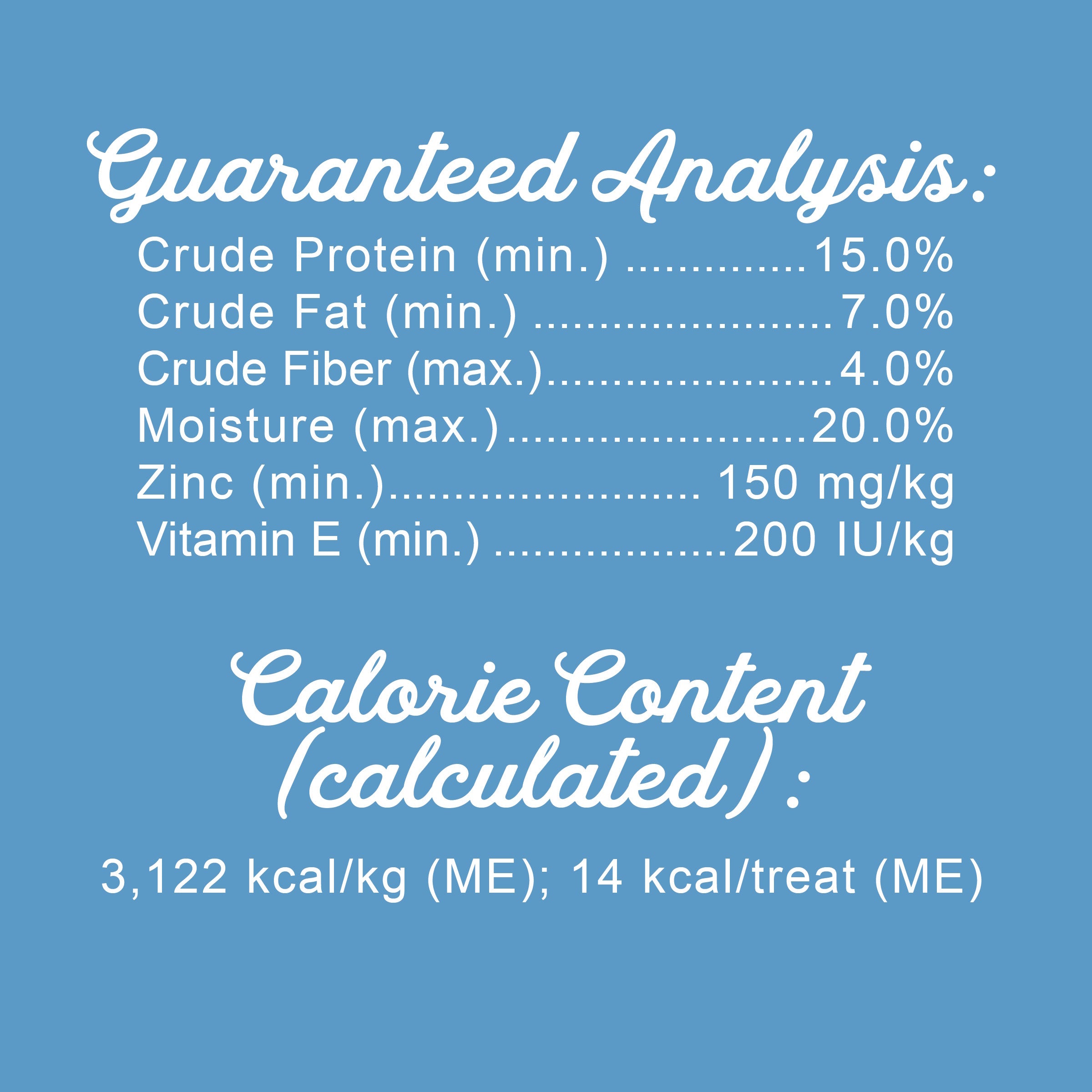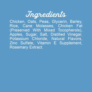 Chicken, Oats, Peas, Glycerin, Barley, Rice, Cane Molasses, Chicken Fat (Preserved With Mixed Tocopherols), Apples, Sugar, Salt, Distilled Vinegar, Potassium Chloride, Natural Flavors, Zinc Sulfate, Vitamin E Supplement, Rosemary ExtractGuaranteed Analysis