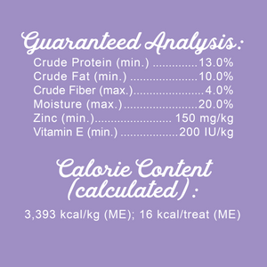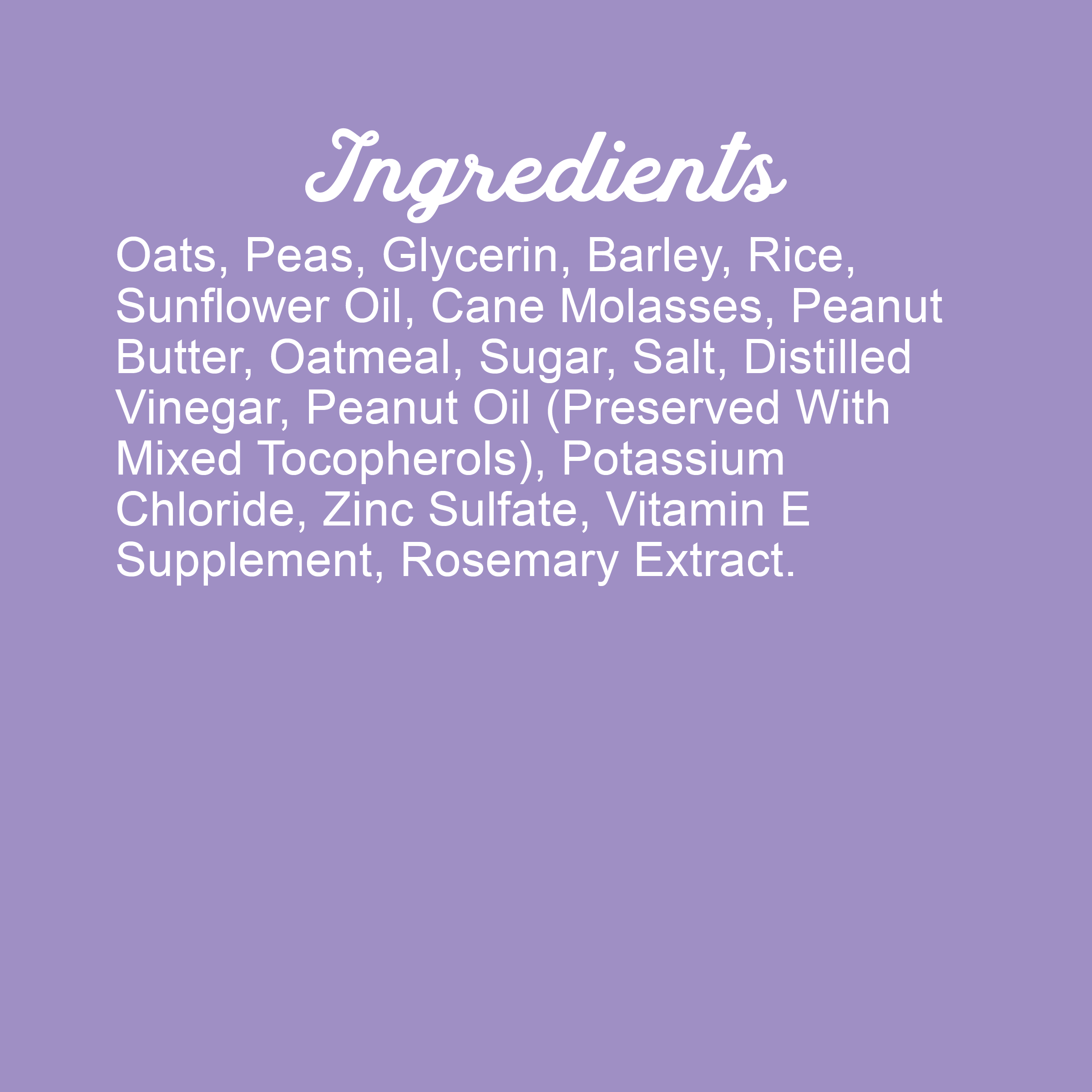 Oats, Peas, Glycerin, Barley, Rice, Sunflower Oil, Cane Molasses, Peanut Butter, Oatmeal, Sugar, Salt, Distilled Vinegar, Peanut Oil (Preserved With Mixed Tocopherols), Potassium Chloride, Zinc Sulfate, Vitamin E Supplement, Rosemary ExtractGuaranteed Analysis